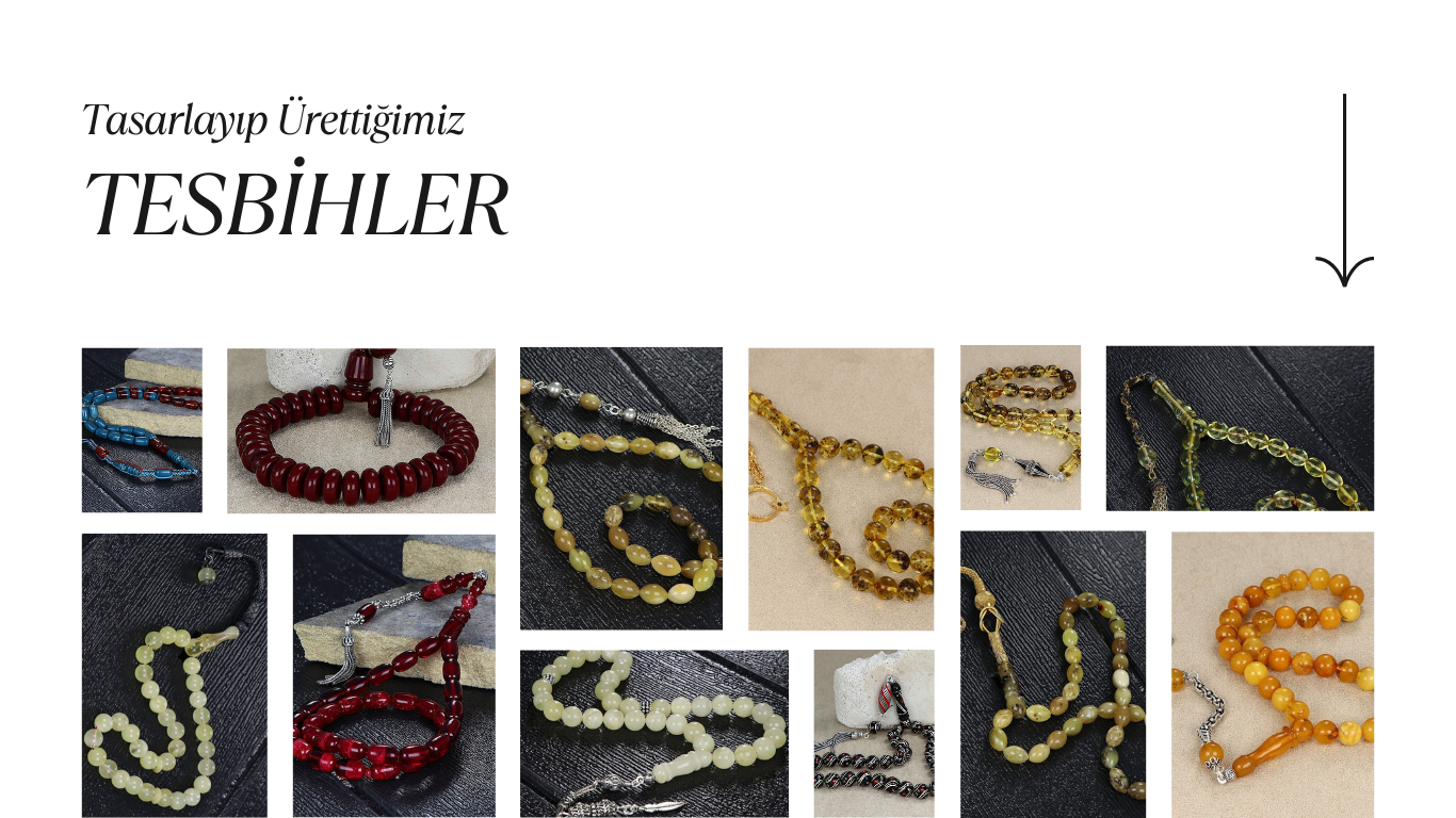 Damla kehribar, sıkma kehribar, oltu taşı ve çeşitli doğal taşlardan yapılan tesbihlerimiz, gümüş püsküllerle tamamlanarak şıklığınızı artırır.